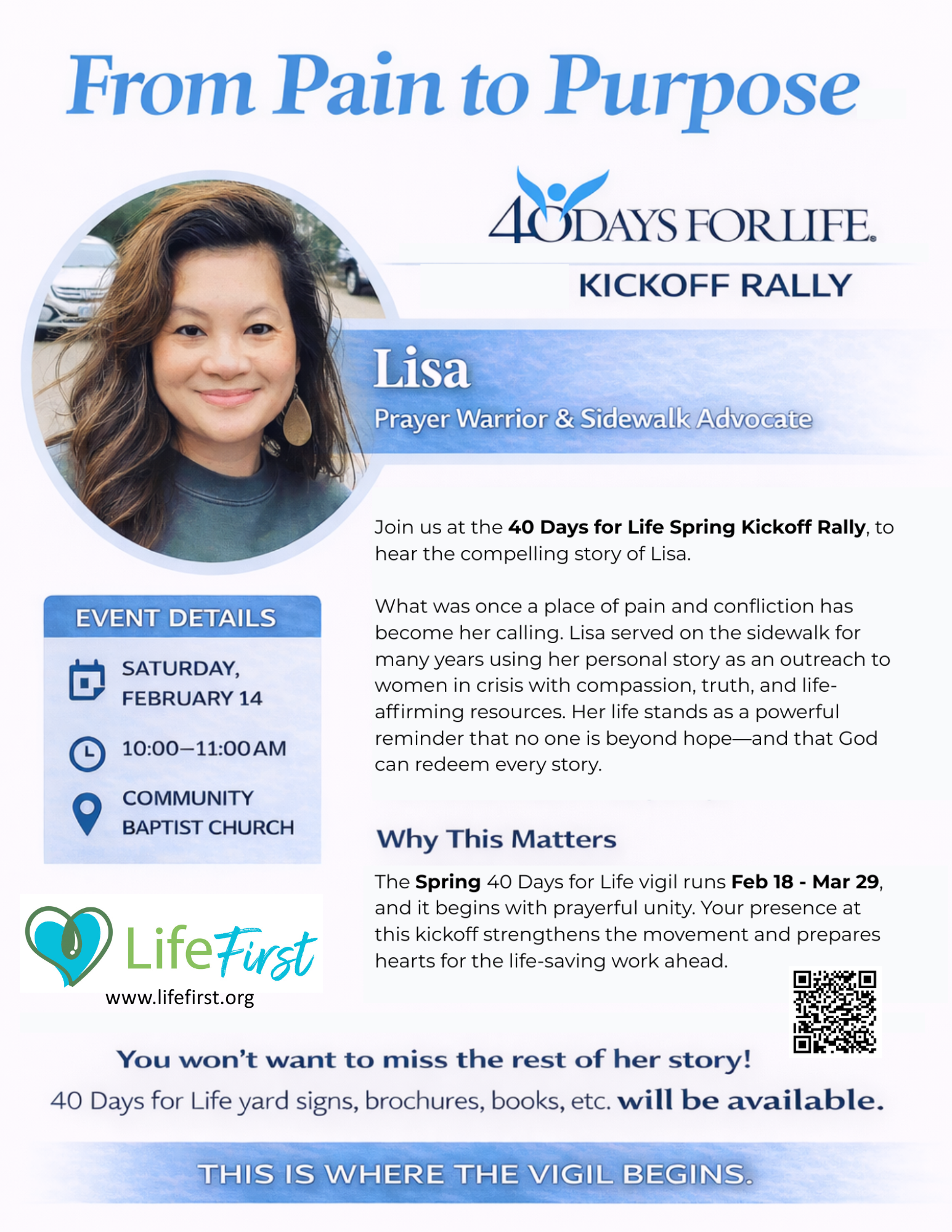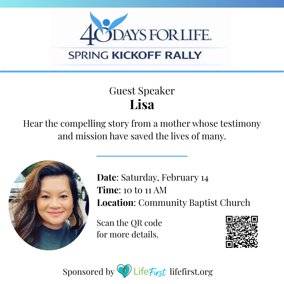 Join us at the 40 Days for Life Kickoff Rally, to hear Lisa’s compelling story.